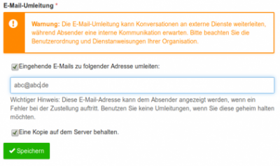 Es ist möglich, eine Weiterleitung einzurichten. Dazu wählt man im Bereich E-Mail Einstellungen aus, gibt bei E-Mail-Umleitung die E-Mail-Adresse an, an die weitergeleitet werden soll. Dann setzt man die Haken bei Eingehende E-Mails … umleiten und bei Eine Kopie auf dem Server behalten, so dass die E-Mails im IServ erhalten bleiben, falls es Probleme mit der Umleitung gibt.